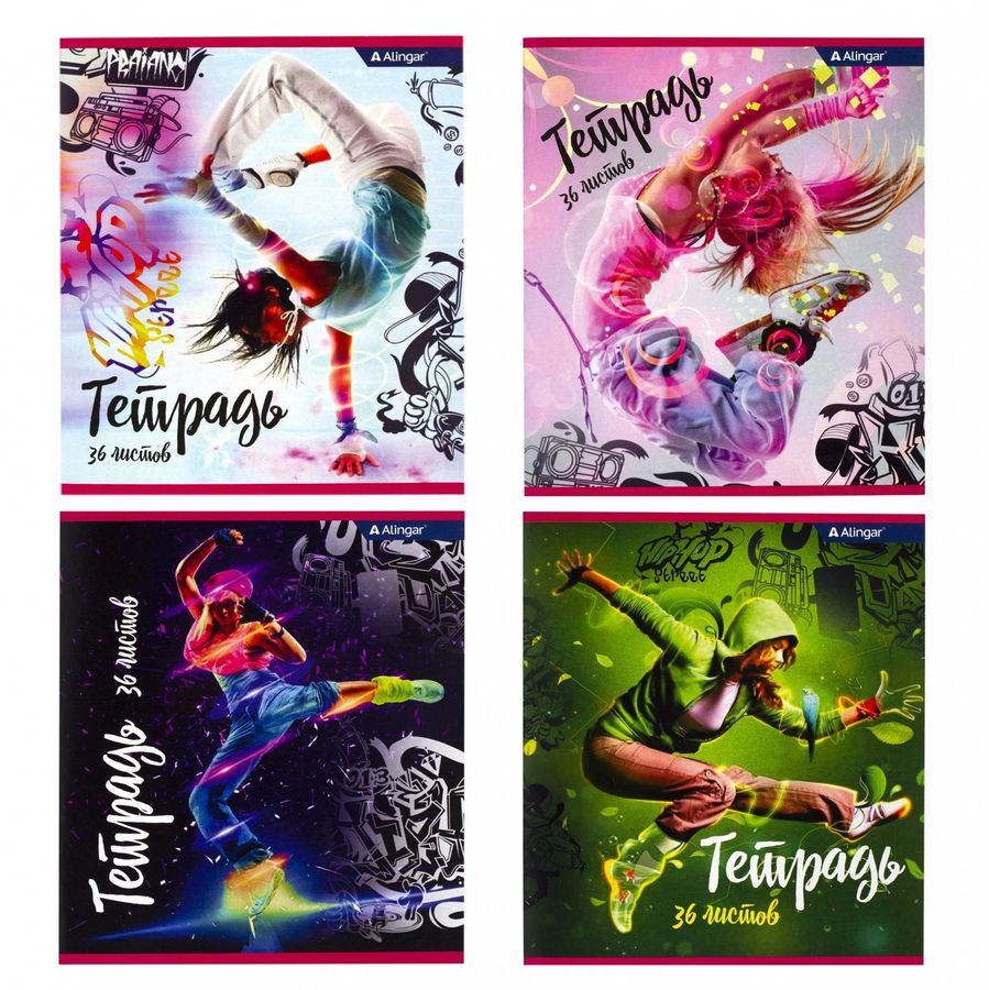 Тетрадь 36л., А5, клетка, Alingar "Девушка в танце", скрепка, блок офсет, 100% белизна, мелованный картон (стандарт), 4 дизайна в пленке т/у