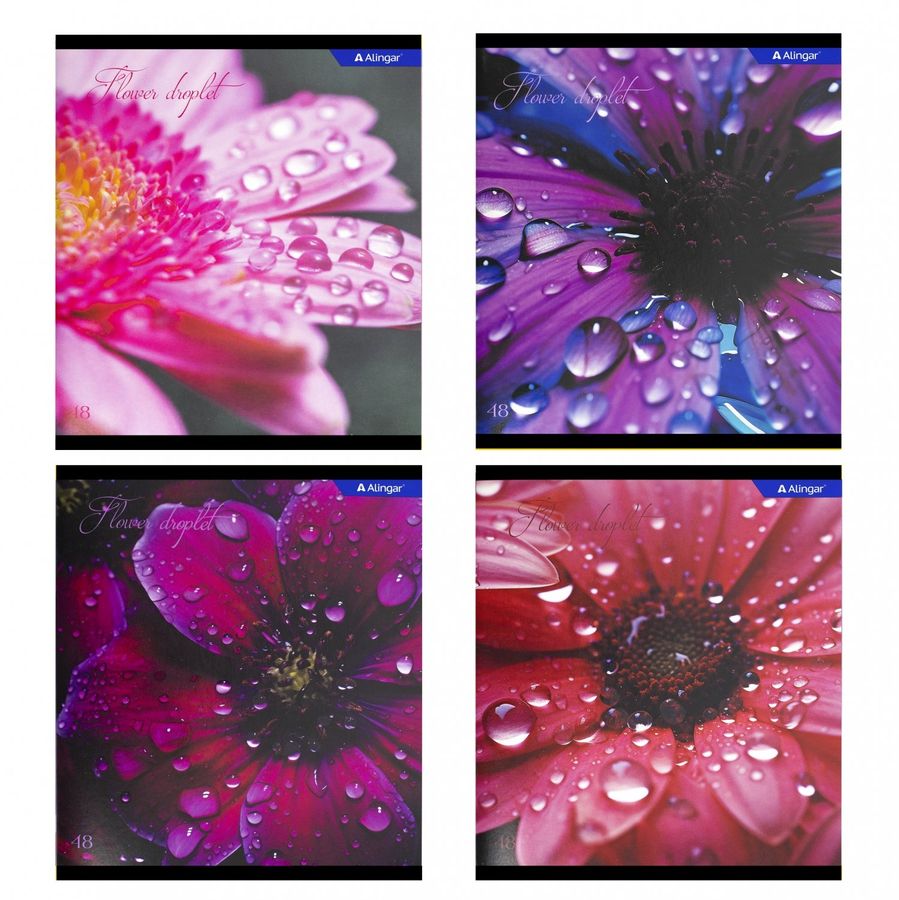 Тетрадь 48л., А5, клетка, Alingar "Drops on flowers", скрепка, мелованный картон (стандарт), выб УФ лак, блок офсет, 4 дизайна в пленке т/у