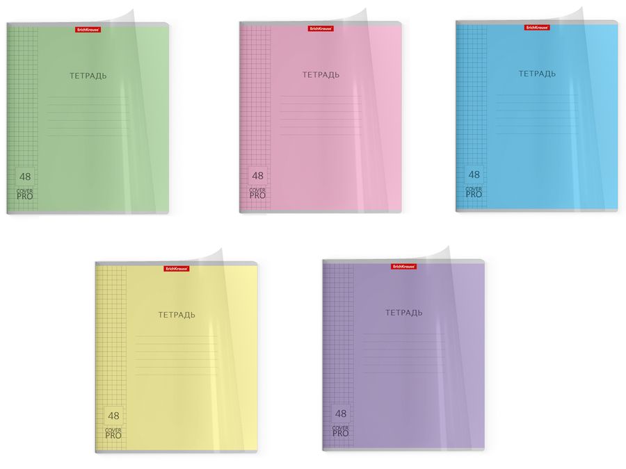 Тетрадь общая ученическая формата А5+ (170x203 мм). Двойная обложка: внешняя выполнена из высококачественного износостойкого прозрачного пластика с фактурой «апельсиновая корка», внутренняя — из качественной мелованной бумаги. В блоке 48 листов в клетку. Бумага офсетная плотностью 60 г/м2. Цвет линовки — синий. Скругленные уголки обложки и блока. Тип скрепления — скоба. Тетради разных дизайнов упакованы в термоусадочную пленку по 5 штук.