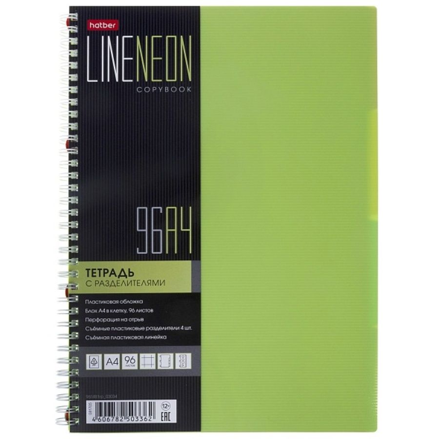 Тетрадь А4 формата 96 листов. Обложка: пластик. Внутренний блок: офсет, клетка, 4 цветных разделителя, с линейкой, перфорация на отрыв. Скрепление: гребень. Тетрадь предназначена для записей, подойдет для старшей школы, вуза, дома и офиса. Стильная рельефная неоновая пластиковая обложка имеет скругленные уголки. Тетрадь имеет 4 полупрозрачных цветных пластиковых разделителя с 'ушками', цепляющихся к гребню на замках. По такому же принципу к тетради крепится прозрачная пластиковая линейка, которая параллельно может служить и закладкой. Скрепление 'гребень' позволяет раскрывать тетрадь на 360 градусов.