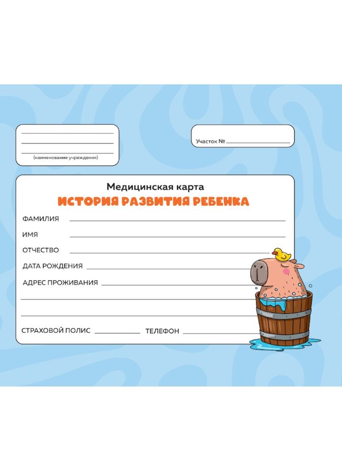 Медицинская карта необходима с рождения каждому малышу. Наша карта составлена по стандартной форме № 112/у История развития ребенка и содержит разделы для сведений о новорожденном, профилактических осмотрах, диагнозах, вакцинации и многом другом, а также большое количество дополнительных страниц. Благодаря твёрдой обложке карта прослужит долгие годы.