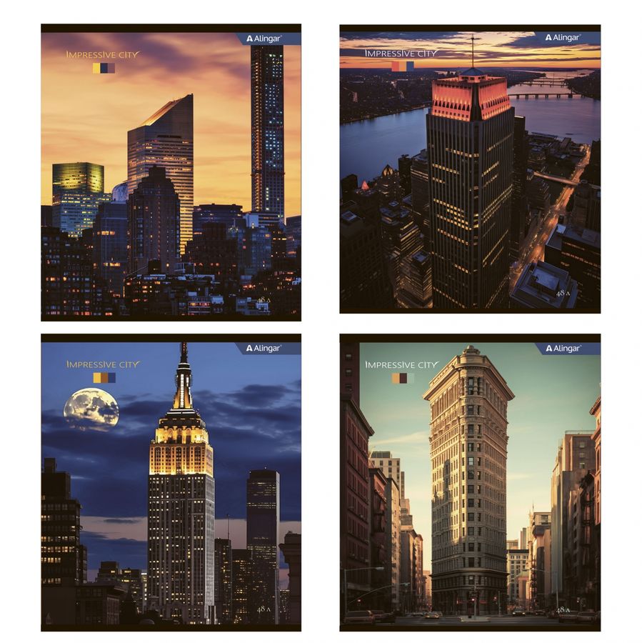 Тетрадь 48л., А5, линия, Alingar "Impression city", скрепка, мелованный картон (стандарт), блок офсет, 4 дизайна в пленке т/у