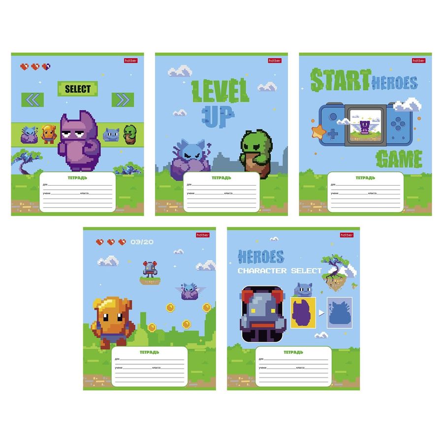 Тетрадь А5 12л клетка мелов.картон Пиксель_Level Up ассорти 5 диз. HATBER 12Т5В1