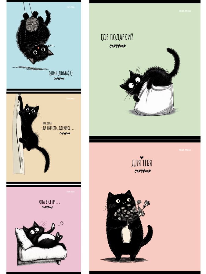 Тетрадь А5 48л клетка скрепка мелов.картон Черный котенок-1 лен ассорти PROF-PRESS 48-4337