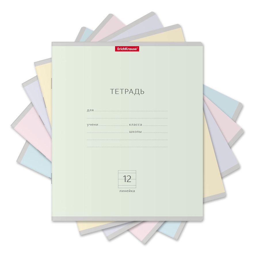 Тетрадь школьная ученическая формата А5+ (170х203 мм). Обложка из высококачественного мелованного картона плотностью 180 г/м2. В блоке 12 листов в линейку с полями. Бумага офсетная плотностью 60 г/м2. Цвет линовки - синий. Скругленные уголки обложки и блока. Тип скрепления - скоба. Тетради разных цветов упакованы в термоусадочную пленку по 10 штук.