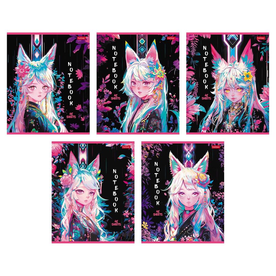 Тетрадь А5 48л клетка скрепка пласт.обл. Кицунэ 5 дизайнов HATBER 48Т5В1пл