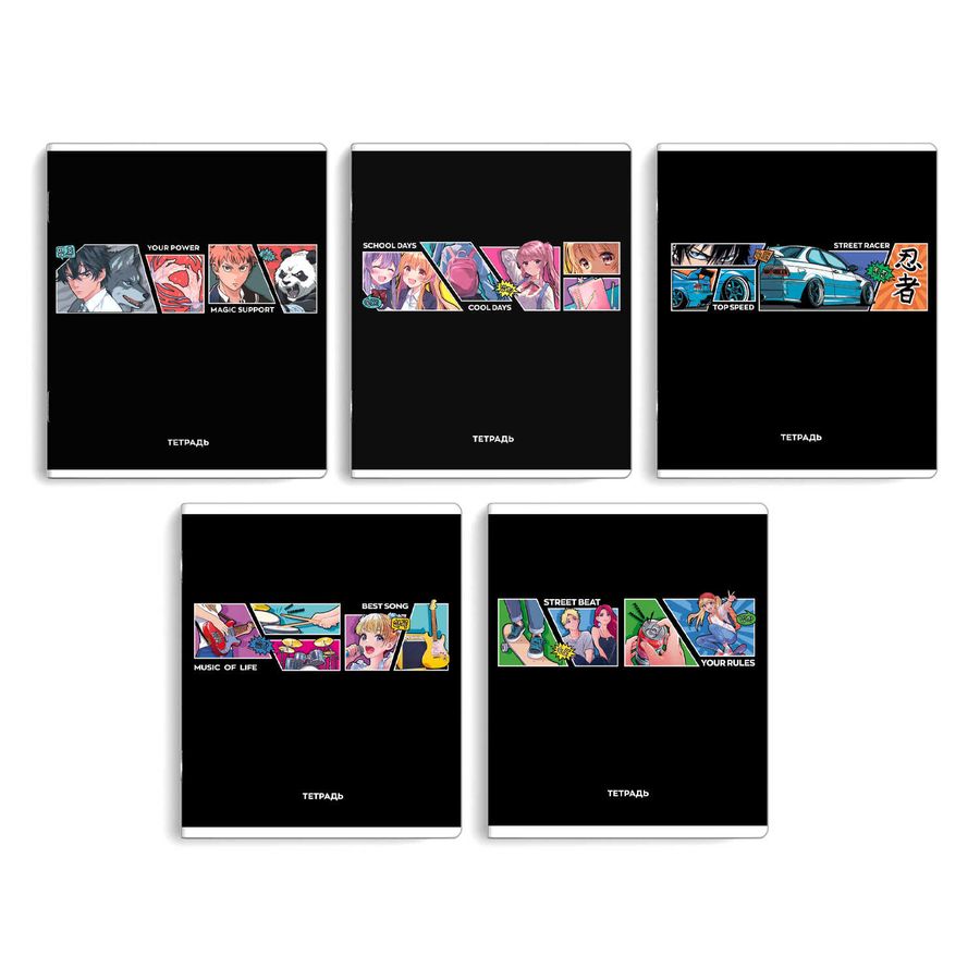 Тетрадь, 48 л, клетка, арт. 68568/ 5 АНИМЕ КОМИКС /А5+, мягкий переплёт (2 скобы), мелованный картон 190 г/м², ламинация "софт-тач" вельвет упаковка ассорти/
