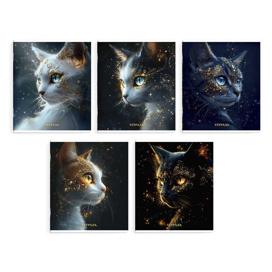 Тетрадь, 48 л, клетка, арт. 68574/ 5 АСТРАЛЬНЫЕ КОТЫ /А5+, мягкий переплёт (2 скобы), обложка - печать по фольге, выборочный ТВИН УФ-лак, мелованный картон 190 г/м², упаковка ассорти/