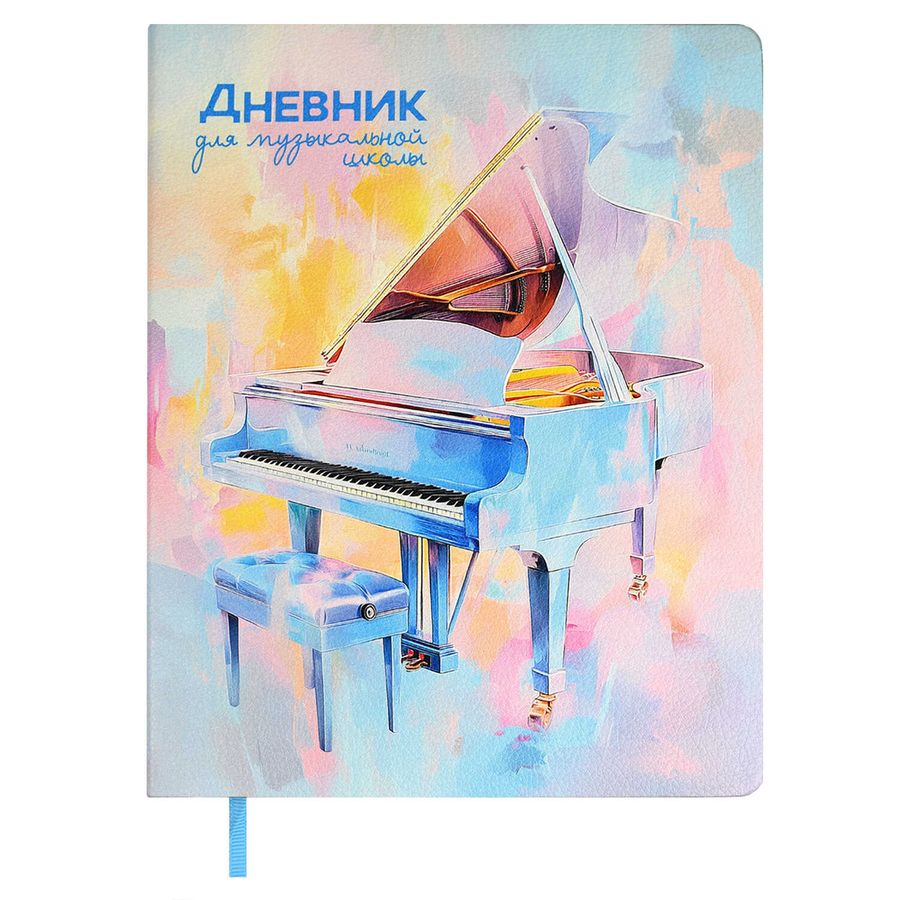 Дневник для музыкальной школы арт. 68824 / 15 РОЯЛЬ (кожзам: А5+; мягкий переплёт, запаянный край, материал обложки: искусственная кожа "Наппа"; декор: печать полноцветная; способ крепления блока: ниткошвейный; вн. блок: 48 л., белый офсет 80 г/м², печать в одну краску, справочный материал: универсальная шпаргалка; закладка: одно ляссе; форзац: печать в одну краску; индивидуальная упаковка: ПЭТ-пакет)
