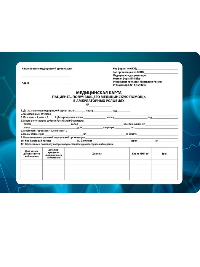 Медицинская карта пациента, получающего медицинскую помощь в амбулаторных условиях, необходима каждому человеку и используется в поликлиниках в обязательном порядке. Наша карта составлена по форме № 025/у, утверждённой Минздравом России и содержит разделы для сведений о диагнозах, назначениях и многом другом, а также большое количество дополнительных страниц для записи всех данных о вашем здоровье. Благодаря твёрдой обложке карта прослужит долгие годы.