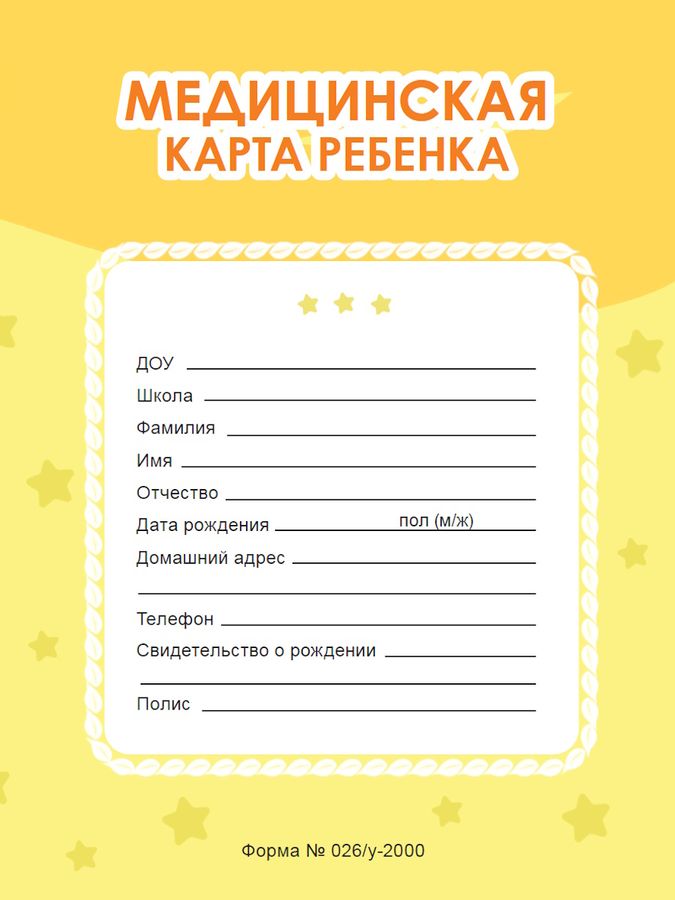 Медицинская карта ребёнка составлена в соответствии с утверждённой формой № 026/у-2000 и предназначена для использования в образовательных учреждениях: детских садах и школах. Обложка карты выполнена из плотного целлюлозного картона с глянцевой ламинацией, благодаря чему карта сохранит аккуратный вид в течение долгого времени.