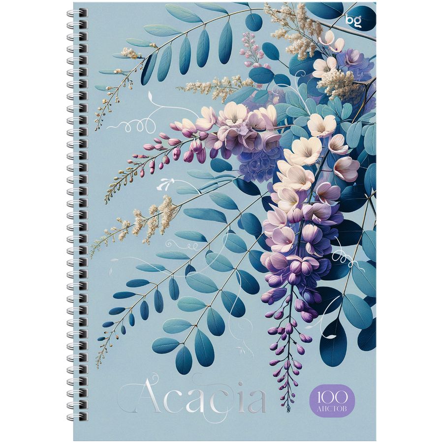 Тетрадь BG «Цветы. Акация» формата А4 (205*285 мм) на гребне – надежный помощник на учёбе и работе. В ней удобно хранить большой объем записей. Внутренний блок – 100 листов офсетной бумаги плотностью 60 м², белизна – 100%, линовка – клетка. Твердая обложка тетради изготовлена из картона с матовой ламинацией и тиснением фольгой.• Количество листов: 100;• Линовка: клетка;• Формат тетради: А4(205*285 мм);• Крепление: гребень.