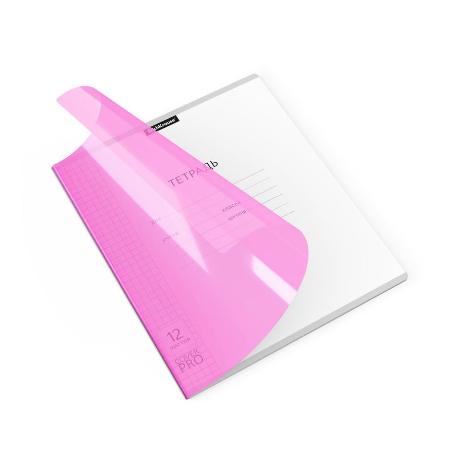 Тетрадь школьная ученическая формата А5+ (170x203 мм). Двойная обложка: внешняя выполнена из высококачественного износостойкого цветного пластика с фактурой «апельсиновая корка», внутренняя — из офсетной бумаги. В блоке 12 листов в клетку. Бумага офсетная плотностью 60 г/м2. Цвет линовки — синий. Скругленные уголки обложки и блока. Тип скрепления — скоба. Тетради упакованы в термоусадочную пленку по 10 штук.