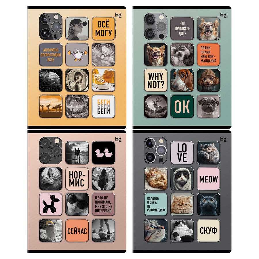 Тетради «Стикеры» от bg — отличный помощник для учёбы или работы. Внутренний блок состоит из 48 листов в клетку с полями. Такого объёма хватит для создания конспектов. Благодаря компактному формату А5 тетрадь легко поместится в папку или рюкзак. Для письма на офсетной бумаге плотностью 60 г/м² подходят любые ручки и карандаши. Обложка из мелованного картона защищает листы от повреждений. В отделке используются конгревное тиснение и выборочный лак. Тетради можно использовать для классных и домашних работ. Дизайн, стилизованный под популярные 3D-стикеры, понравится школьникам любого года обучения. Изделия поставляются комплектом из четырех штук.