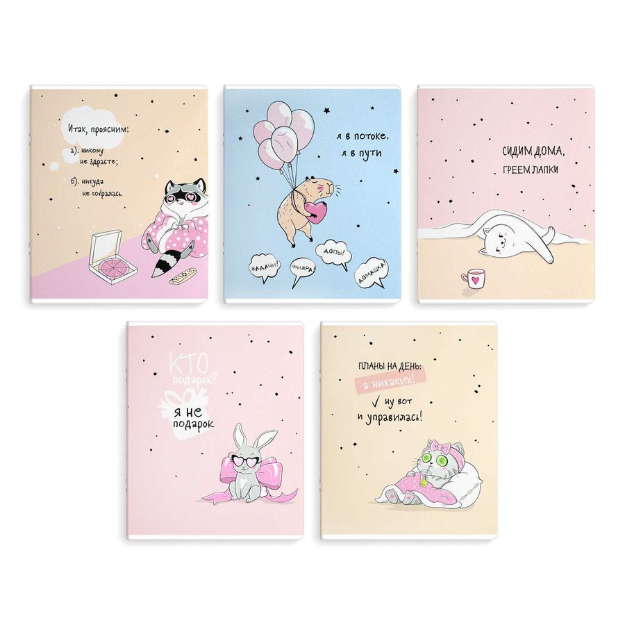 Тетрадь, 48 л, клетка, арт. 70939/ 5 ПУШИСТЫЕ МЕЧТАТЕЛИ /А5+, мягкий переплёт (2 скобы), мелованный картон 190 г/м², матовая ламинация, эмбоссированная поверхность обложки, упаковка ассорти/