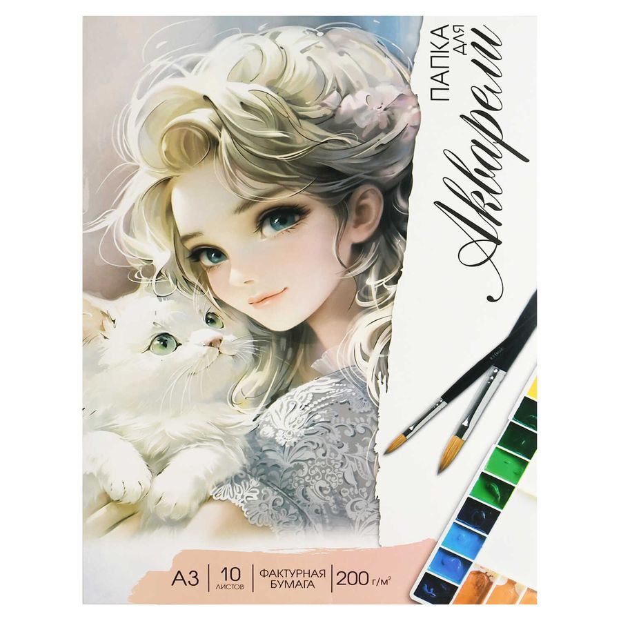 Папка для акварели 10 л, арт. 69931 БЛОНДИНКА С КОТЕНКОМ /А3 блок - белая акварельная бумага 200 г/м², обложка - полноцветная печать, папка с клапанами