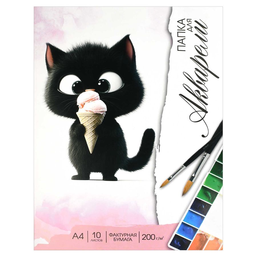 Папка для акварели, КОТЕНОК С МОРОЖЕНЫМ. (формат А4). Количество листов: 10 листов. Внутренний блок - белая акварельная бумага 200 г/м². Обложка - мелованный картон 240 г/м², Вид крепления - папка с клапанами.