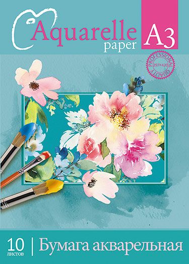 Папка для акварели, 10 листов, формат А3, плотность 180 гр/м2. Внутренний блок - высококачественная акварельная бумага. Упаковка - папка из мелованного картона, полноцветная печать с ВД-лаком.