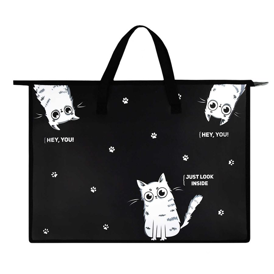 Папка для чертежей и рисунков. ТРИ КОТА. Формат А3. Размер: 45x33х9 см. Материал: полипропилен. Толщина: 500 мкм. Количество отделений - 1 отделение (-я). Тип застёжки: молния. Отделка: УФ-печать. Цвет: черный, белый. Особенности: карман внутренний из ПВХ