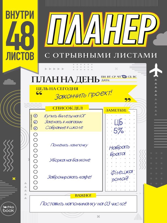 Планер с отрывными листами поможет фиксировать все ваши задачи на текущий день. Лист разделен функциональные зоны и имеет линовку в точку-всё это делает планирование максимально удобным. В планере 48 двухсторонних отрывных листов, поэтому его хватит на три месяца.