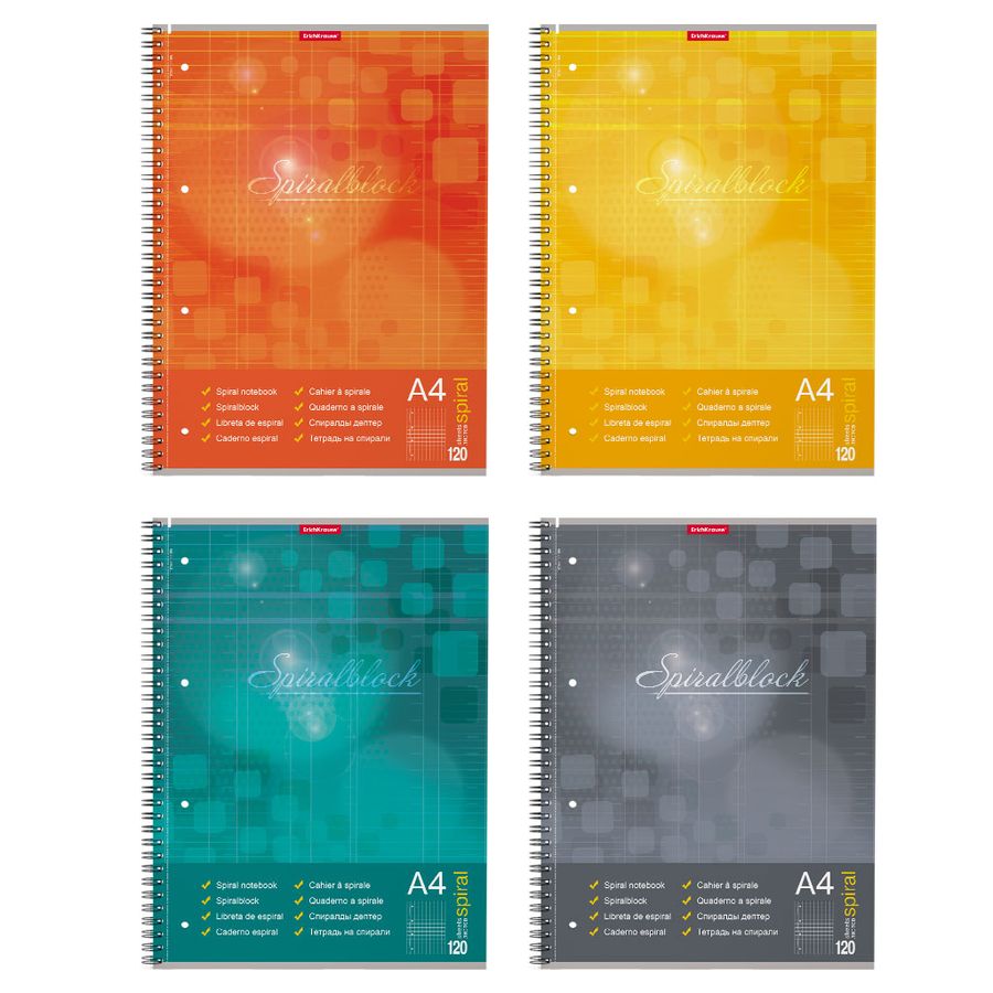 Тетрадь общая формата А4 (220х297 мм). Обложка из высококачественного мелованного картона плотностью 190 г/м2. Плотная подложка 340 г/м2. В блоке 120 листов в клетку. Бумага офсетная плотностью 60 г/м2. Микроперфорация для отрыва. Перфорация для подшивки. Цвет линовки - синий. Тип скрепления - спираль. Тетради разных цветов упакованы в термоусадочную плёнку по 4 штуки.