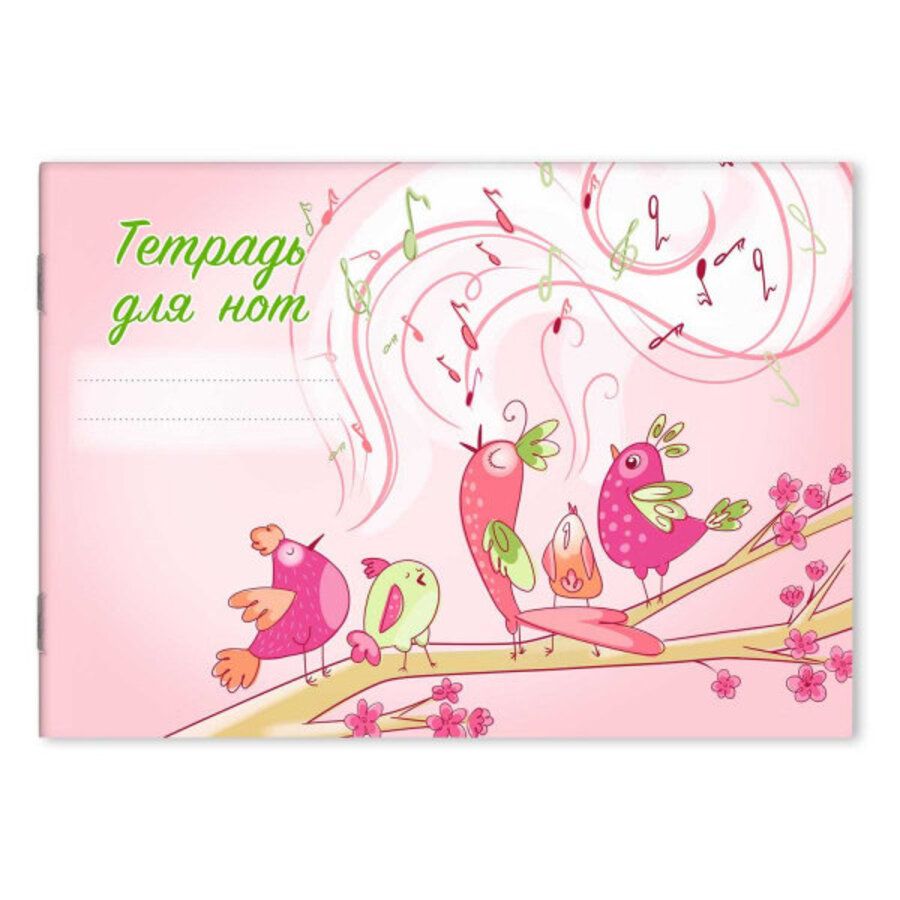Тетрадь для нот. ПОЮЩИЕ ПТИЧКИ. Формат А5, Количество листов - 16 л. Тип обложки - мягкий переплёт (2 скобы по короткой стороне). Материал обложки: мелованный картон 190 г/м². Печать обложки: полноцветная печать (4+4). Ламинация обложки - глянцевая ламинация. Цвет внутреннего блока - белый офсет. Плотность бумаги 65 г/м². Красочность блока: печать в одну краску.