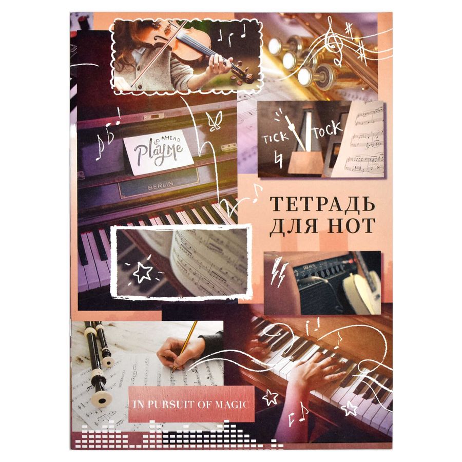 Тетрадь для нот. ТВОРЧЕСКИЕ БУДНИ. Размер: 205x280 мм. Формат А4, Количество листов - 8 л. Тип обложки - мягкий переплёт (2 скобы). Материал обложки: офсетная бумага 120 г/м². Печать обложки: полноцветная печать. Цвет внутреннего блока - белый офсет.