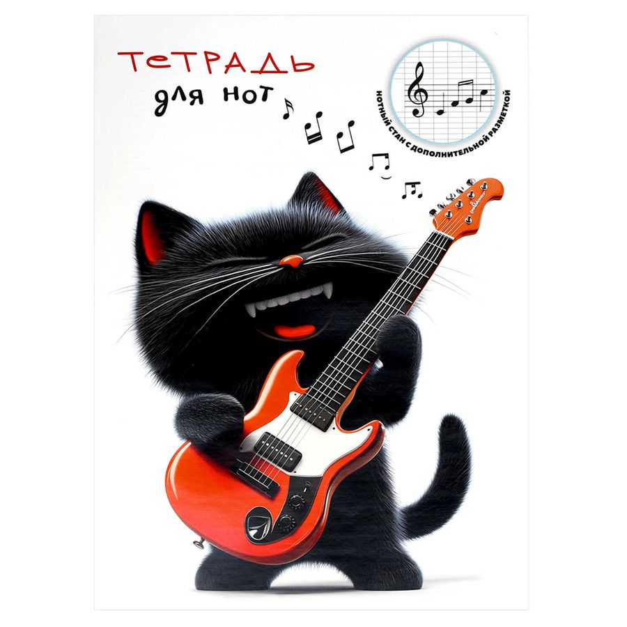 Тетрадь для нот 16 л. арт. 69900 КОТЕНОК С ГИТАРОЙ /А4, белый офсет, мягкий переплёт (2 скобы), облож.- мелованная бумага 130 г/м².
