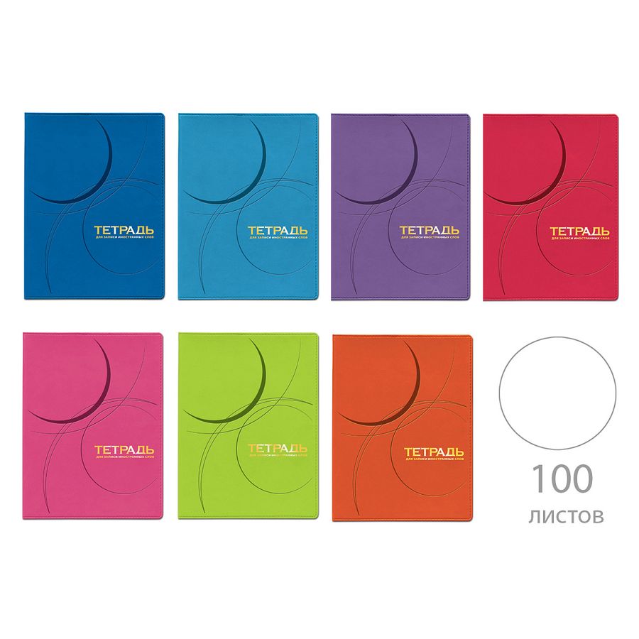 Возможны 7 вариантов расцветки: красный, синий, голубой, розовый, сиреневый, салатовый, оранжевый. Интегральная обложка тетради, итальянский переплетный материал. Периметр обложки прострочен нитками. Эффекты: изображение создано путем горячего тиснения, изменяющего первоначальный цвет специального термоактивного материала. Используется тиснение золотой фольгой надписи "Тетрадь для записи иностранных слов". Есть закладка в виде тесьмы, выполненной из тканного материала.