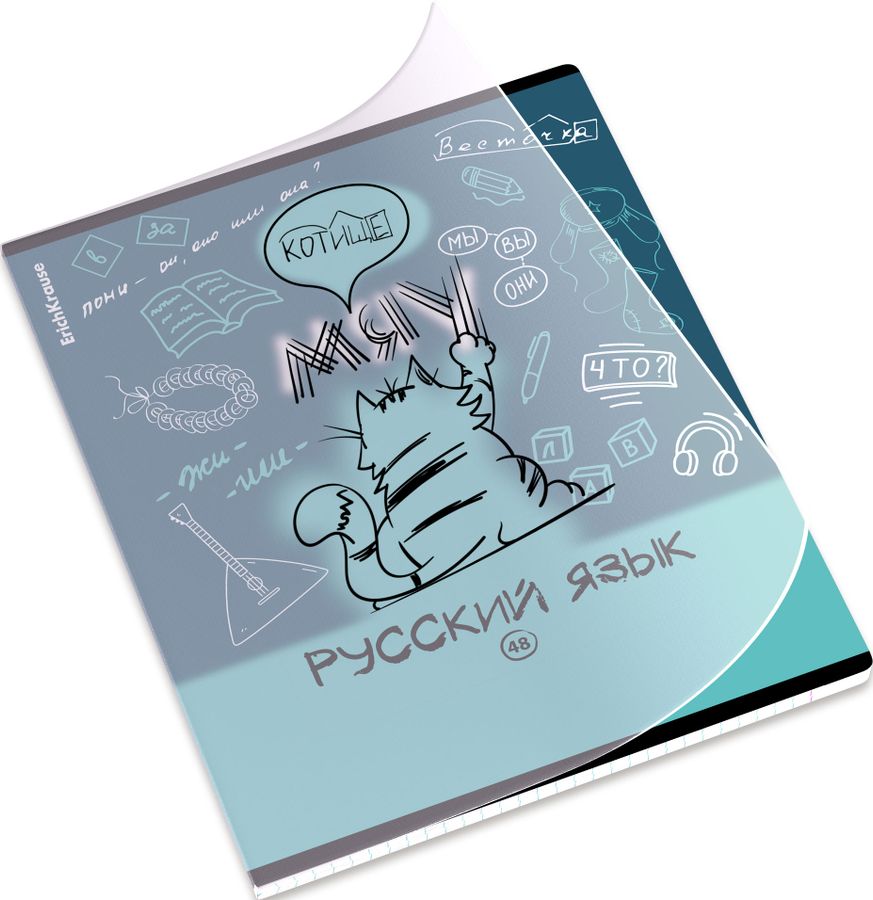 Тетрадь предметная формата А5+ (170x203 мм). Двойная обложка: внешняя выполнена из высококачественного износостойкого прозрачного пластика с фактурой «апельсиновая корка», внутренняя — из качественной мелованной бумаги. В блоке 48 листов в линейку с полями. Бумага офсетная плотностью 60 г/м2. Белизна бумаги - 100%. Цвет линовки - синий. Скругленные уголки обложки и блока. Тип скрепления - скоба. Имеет инфо-блок с кратким изложением школьной программы. Тетради упакованы в термоусадочную плёнку по 5 штук.