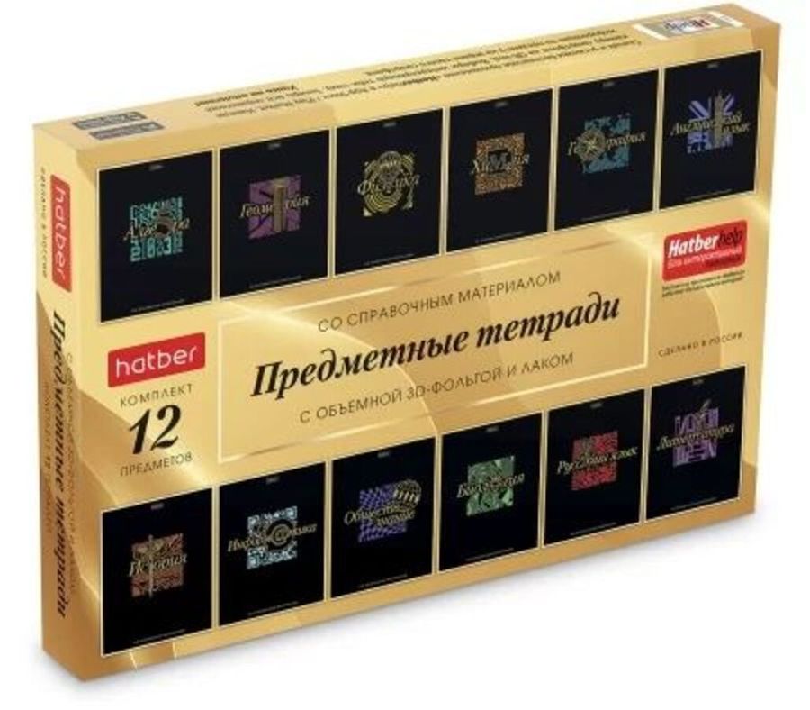 Комплект предметных тетрадей серии «Салют предметов» состоит из 12 школьных предметов с титульным листом и справочным материалом в подарочной упаковке. Справочный материал на оборотной стороне обложки. Обложка выполнена из мелованного картона с матовой ламинацией 3D фольгой и 3D лаком. Внутренний блок состоит из 48 листов офсетной бумаги плотностью 65 гм2 и белизной блока 100%. Цвет линовки: серый. «Салют предметов» - это сочетание сдержанности и роскоши. Обложки тетрадей выполнены в глубоком черном цвете, создавая эффектный контраст с объемными золотыми элементами изображенных на ней предметов. Использование 3D-фольги и 3D-лака делает эти изображения словно живыми при игре света, а приятная на ощупь матовая ламинация добавляет особой элегантности. Для тех, кто ценит красивые и стильные вещи. Кол-во листов: 48; Линовка: клетка/линия, красные поля; Формат (и размер): А5 (165*205 мм); Белизна: 100 %; Плотность блока: 65 гм2; Крепление: скрепка. Предметы: алгебра, биология, география, литература, русский язык, английский язык, история, геометрия, физика, обществознание, химия, информатика. Все предметные тетради Hatber поддерживают приложение с интерактивной справочной информацией HatberHelp. Достаточно скачать его бесплатно в App Store или Google Play, навести камеру смартфона на QR-код на обложке, и выбрать интересующую тему из школьной программы. Приложение работает без доступа в интернет.