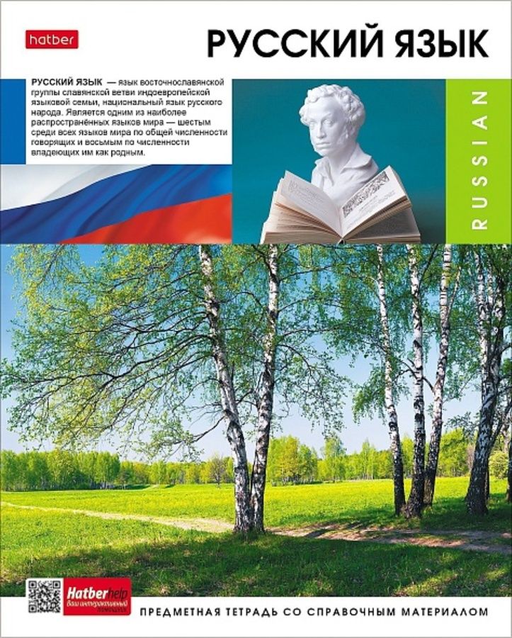 Тетрадь предметная Русский язык из серии Вперед к знаниям (в серии 17 школьных предметов) со справочным материалом на внутренней стороне обложки.