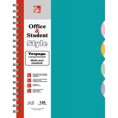 Тетради офисные А5 120 листов Пластиковая обложка Бирюзовая 5 цветов пласт.раздел. ТПР512023