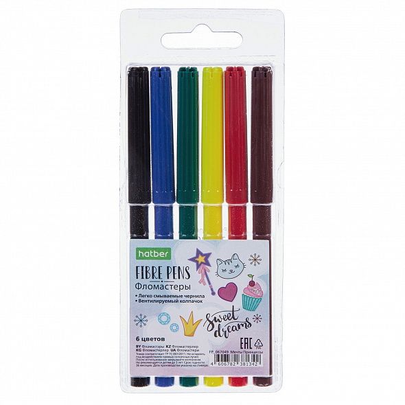 В наборе 6 фломастеров для рисования на бумаге. Корпус изготовлен из полипропилена, имеет вентилируемый колпачок. Легко смываемые чернила не токсичны и безопасны для детей. Срок годности: 3 года. Длина линии: не менее 500 метров. Фломастеры упакованы в блистер с петлей-европодвесом.