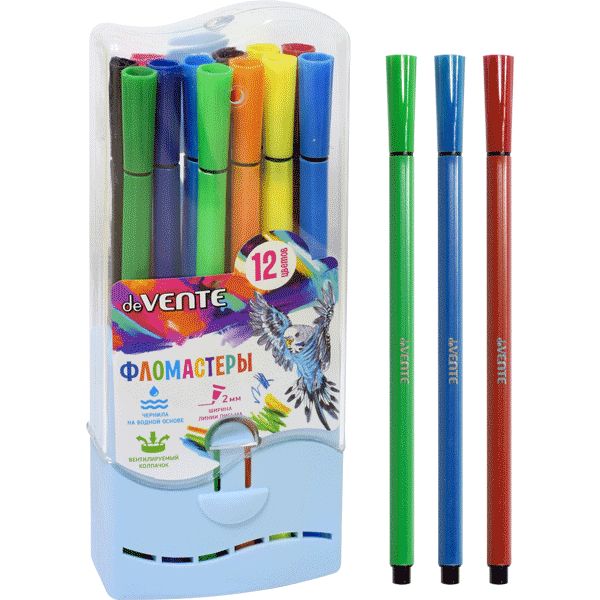 Фломастеры "deVENTE" 12 цветов, шестигранный корпус 8x165 мм, с вентилируемым колпачком, в плоской пластиковой подставке с подвесом, голубая подставка