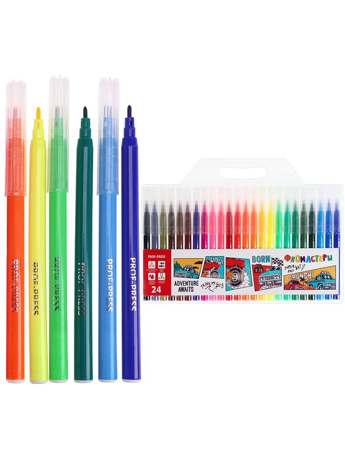 Фломастеры — это друзья детства каждого ребенка! Они не только помогают развитию мелкой моторики, но и способствуют выражению своих эмоций через рисунок! Яркие насыщенные цвета и качество — всё, что нужно для красивого рисунка и хорошего настроения! Фломастеры от компании "Проф-Пресс" представлены в наборе из 24 цветов с вентилируемым колпачком. Продаются в пластиковом блистере с европодвесом.