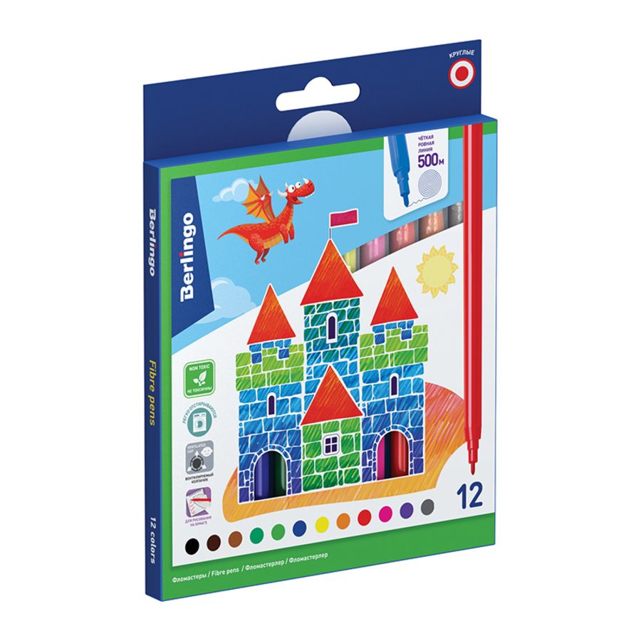 Фломастеры Berlingo серии «Замки» представлены с легкосмываемыми чернилами и вентилируемым прозрачным колпачком. Толщина линии письма составляет 2 мм, а длина линии письма – не менее 500 метров. В наборе 12 ярких цветов: оранжевый, фиолетовый, красный, светло-коричневый, тёмно-коричневый, зелёный, светло-зелёный, жёлтый, синий, чёрный, серый, розовый. Корпус круглой формы изготовлен из полипропилена и имеет удобную зону захвата. Тип наконечника – конический. Смываемые фломастеры на водной основе нетоксичны. Набор фломастеров упакован в яркую лакированную картонную коробку с европодвесом.• Количество цветов: 12;• Тип наконечника: конический;• Длина линии письма: 500 метров.