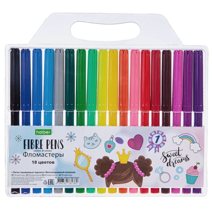 В наборе 18 фломастеров для рисования на бумаге. Корпус изготовлен из полипропилена, имеет вентилируемый колпачок. Легко смываемые чернила не токсичны и безопасны для детей. Срок годности: 3 года. Длина линии: не менее 500 метров. Фломастеры упакованы в блистер с петлей-европодвесом.