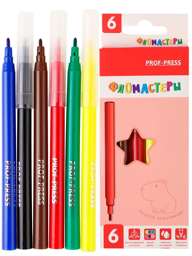 Фломастеры 6цв круглые конусовид. вент. колпачок к/к Капибара PROF-PRESS ФЛ-4893
