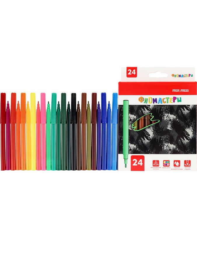 Фломастеры — это друзья детства каждого ребенка! Они не только помогают развитию мелкой моторики, но и способствуют выражению своих эмоций через рисунок! Яркие насыщенные цвета и качество — всё, что нужно для красивого рисунка и хорошего настроения! Фломастеры от компании "Проф-Пресс" представлены в наборе из 24 цветов с вентилируемым колпачком. Продаются в картонной коробке.