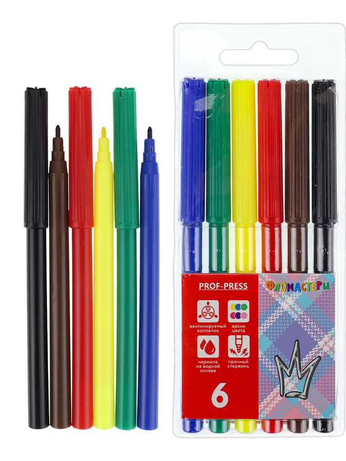 Фломастеры — это друзья детства каждого ребенка! Они не только помогают развитию мелкой моторики, но и способствуют выражению своих эмоций через рисунок! Яркие насыщенные цвета и качество — всё, что нужно для красивого рисунка и хорошего настроения! Фломастеры от компании "Проф-Пресс" представлены в наборе из 6 цветов с невентилируемым колпачком. Продаются в блистере с европодвесом.