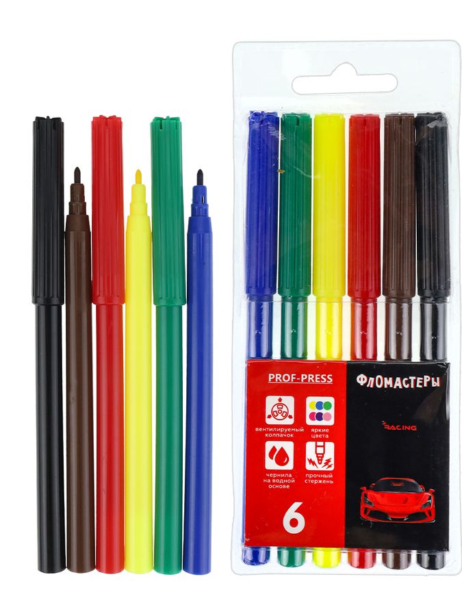 Фломастеры 6цв круглые конусовид. вент. колпачок блистер Красное авто PROF-PRESS ФВ-2555