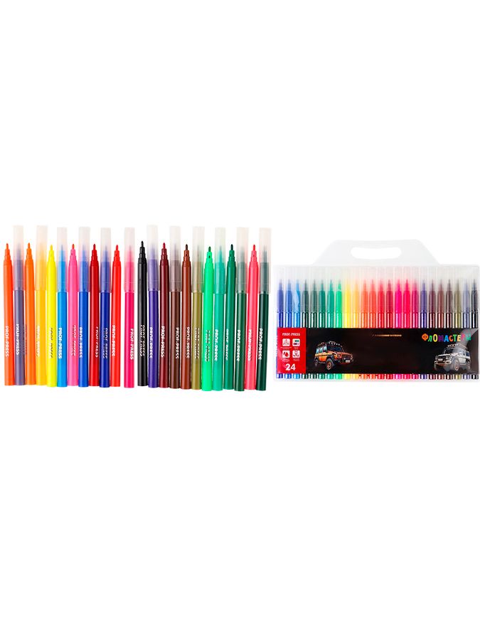 Фломастеры — это друзья детства каждого ребенка! Они не только помогают развитию мелкой моторики, но и способствуют выражению своих эмоций через рисунок! Яркие насыщенные цвета и качество — всё, что нужно для красивого рисунка и хорошего настроения! Фломастеры от компании "Проф-Пресс" представлены в наборе из 24 цветов с вентилируемым колпачком. Продаются в пластиковом блистере с европодвесом.