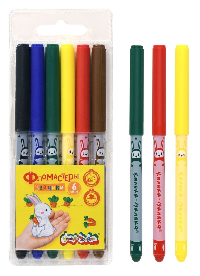 Фломастеры Каляка-Маляка® одни из самых ярких, долговечных и безопасных фломастеров на рынке. Разработаны для детей в возрасте от 3 лет. Весёлые зайчики на корпусе привлекут внимание ребенка и несомненно помогут увлечь его в мир творчества! Фломастеры Каляка-Маляка® соответствуют самым высоким мировым стандартам качества и безопасности! - Полипропиленовый корпус обладает повышенной устойчивостью к излому, не образует острых краев при повреждении. - Безопасный вентилируемый колпачок обеспечит свободное прохождение воздуха при случайном попадании в дыхательные пути. - Прочный пишущий узел не деформируется и не продавливается. - Чернила на водной основе. Свежие следы фломастеров легко отстирываются с большинства тканей и смываются с кожи ребёнка!