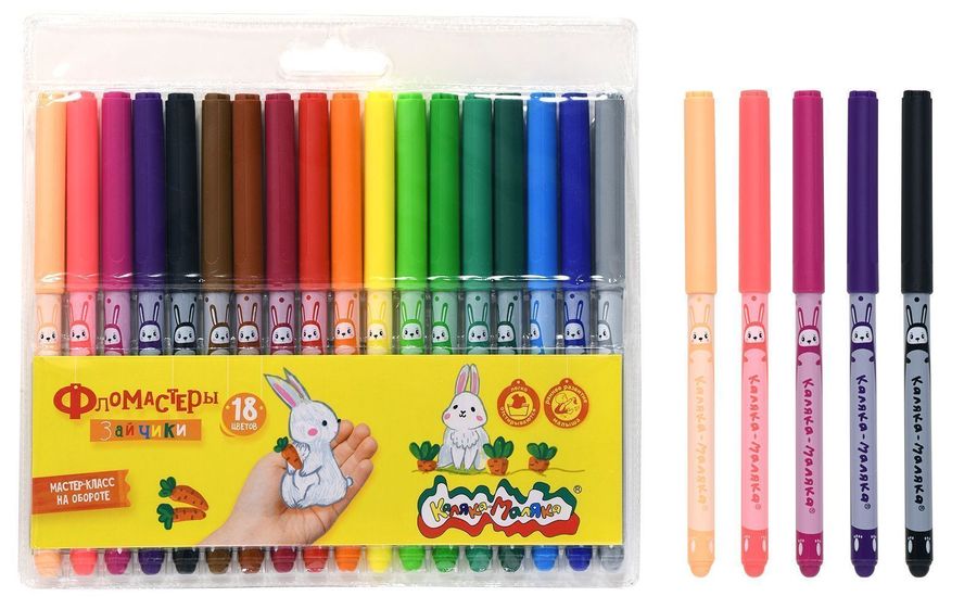 Фломастеры Каляка-Маляка® одни из самых ярких, долговечных и безопасных фломастеров на рынке. Разработаны для детей в возрасте от 3 лет. Весёлые зайчики на корпусе привлекут внимание ребенка и несомненно помогут увлечь его в мир творчества! Фломастеры Каляка-Маляка® соответствуют самым высоким мировым стандартам качества и безопасности! - Полипропиленовый корпус обладает повышенной устойчивостью к излому, не образует острых краев при повреждении. - Безопасный вентилируемый колпачок обеспечит свободное прохождение воздуха при случайном попадании в дыхательные пути. - Прочный пишущий узел не деформируется и не продавливается. - Чернила на водной основе. Свежие следы фломастеров легко отстирываются с большинства тканей и смываются с кожи ребёнка!