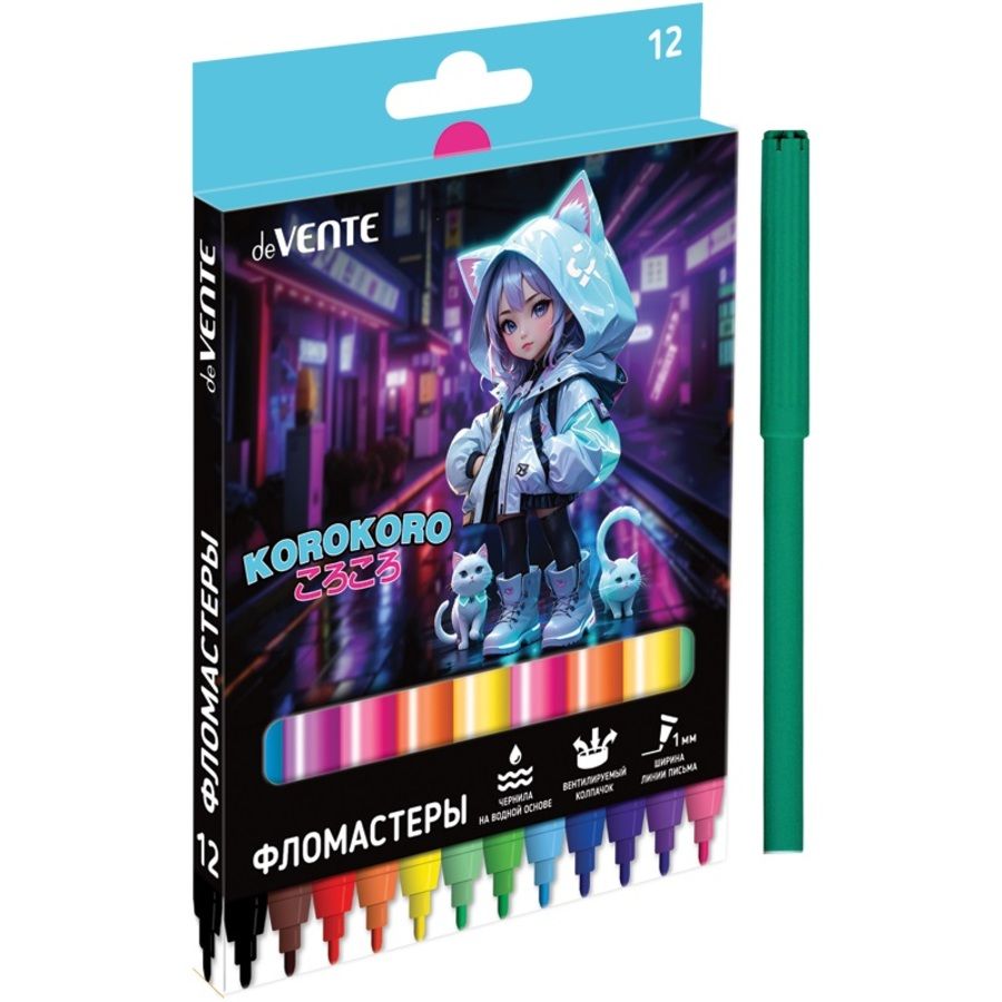 Фломастеры "deVENTE. Korokoro" 12 цветов с вентилируемым колпачком, в картонной коробке с подвесом