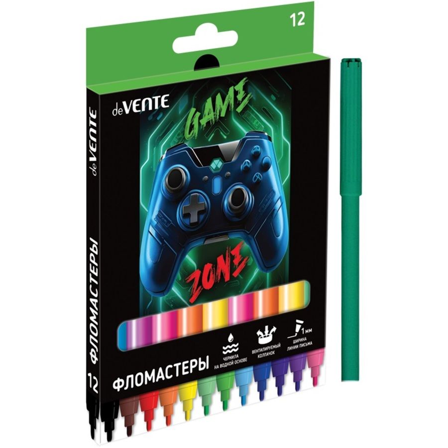 Фломастеры "deVENTE. Gamer" 12 цветов с вентилируемым колпачком, в картонной коробке с подвесом