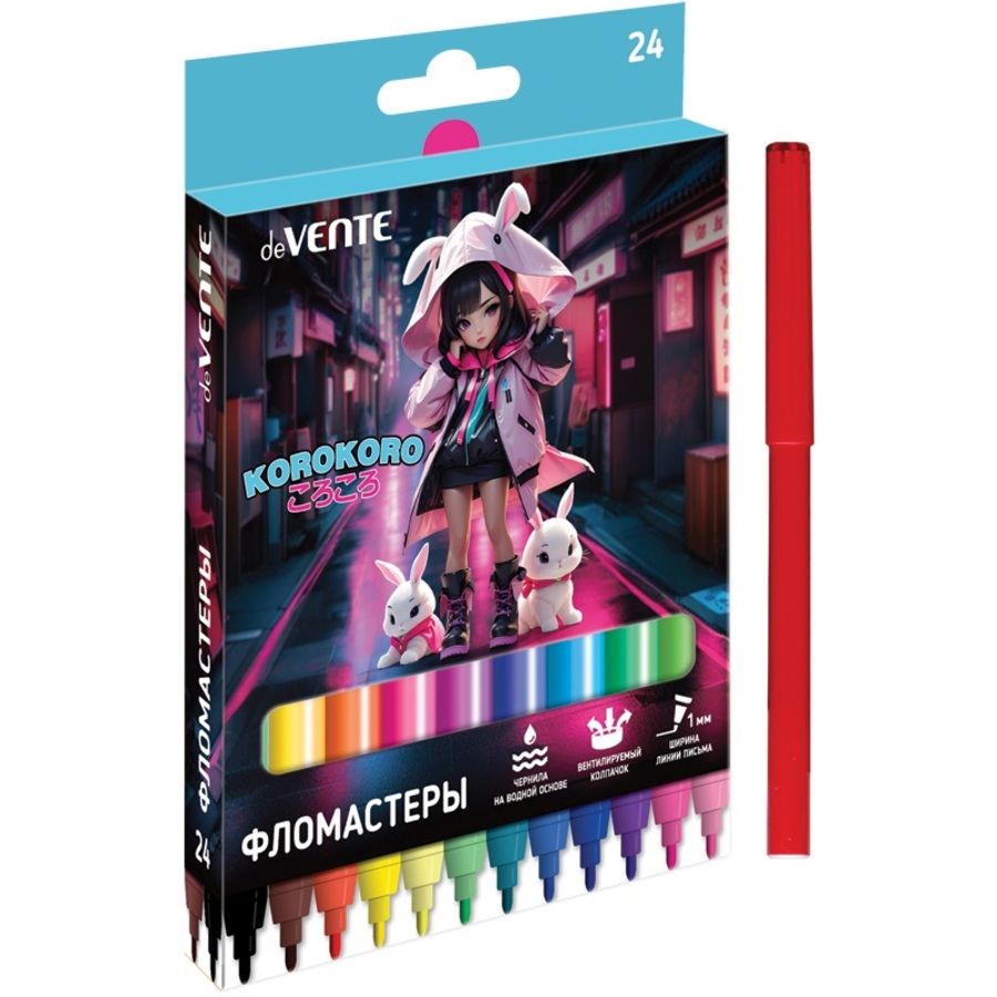 Фломастеры "deVENTE. Korokoro" 24 цвета с вентилируемым колпачком, в картонной коробке с подвесом