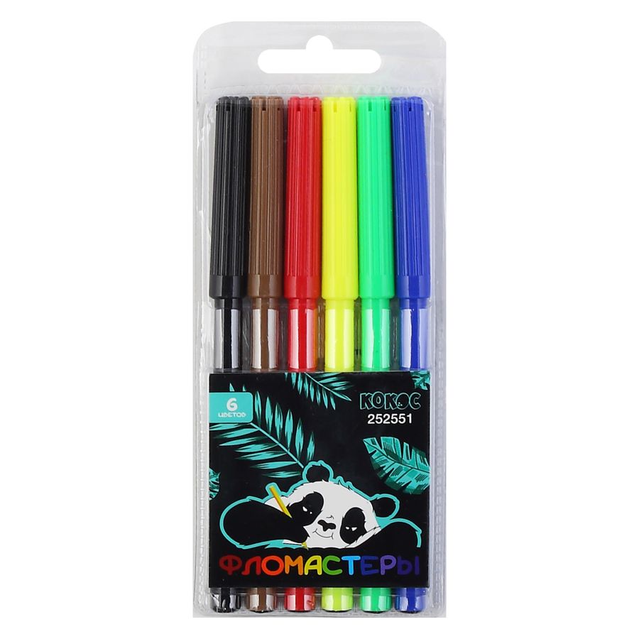 Фломастеры, 6 цветов, корпус круглый, конический, смываемые, колпачок вентилируемый, Панда, КОКОС, 252551