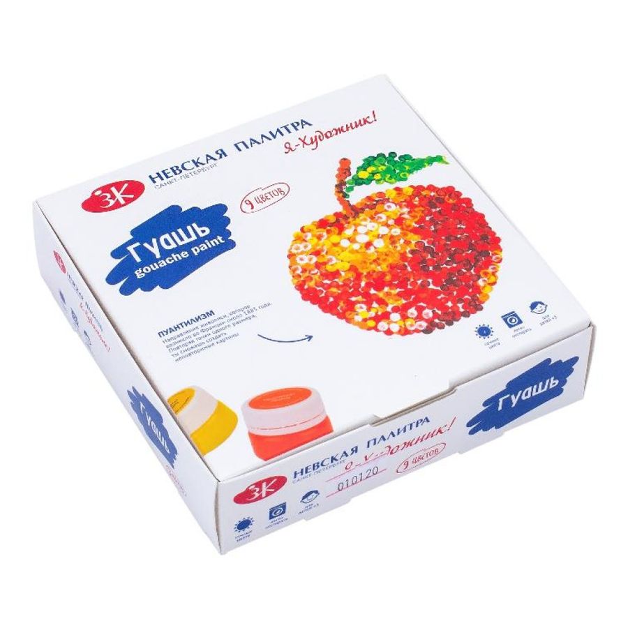 Отличительная особенность гуаши яркие и насыщенные цвета. Легко отмывается с поверхности. Сохраняют цвет после высыхания, приобретают бархатистую текстуру. При нанесении толстым слоем не растрескиваются. При разведении водой приобретают свойства акварели – ложится полупрозрачным равномерным слоем. Состав: Белая, желтая, охра, красная или алая, розовая, синяя, зеленая темная, коричневая, черная